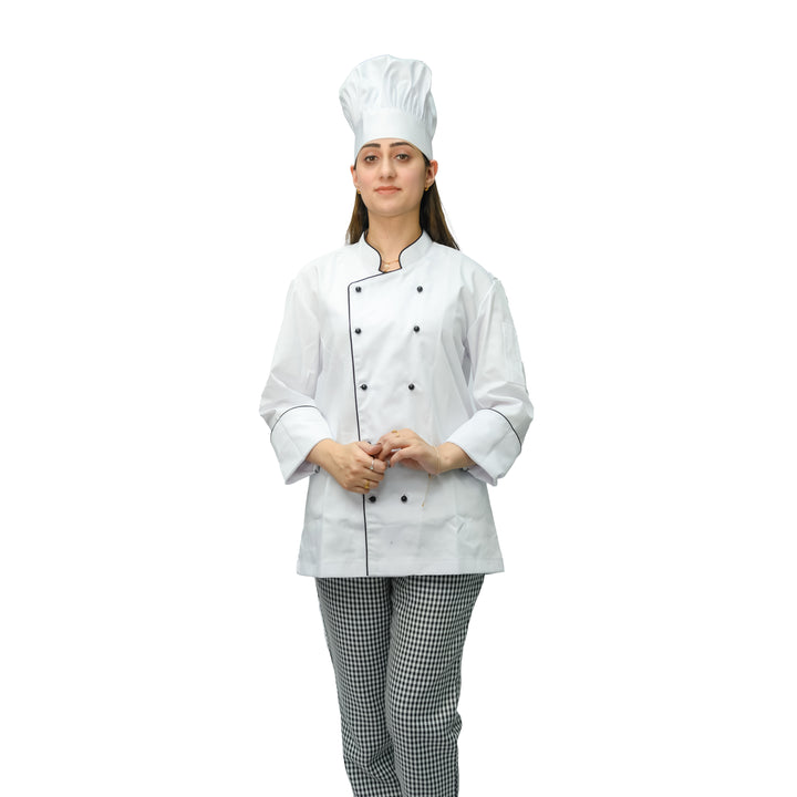 The Unisex chef jacket is designed for all types of kitchen work in white color . It has beautiful black buttons on the front of the jacket to adjust it . Available in white color and different sizes.