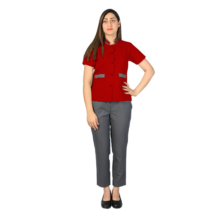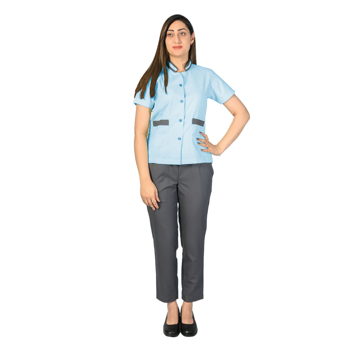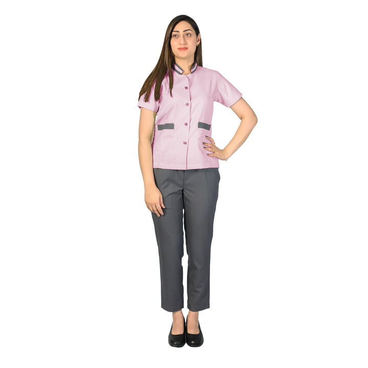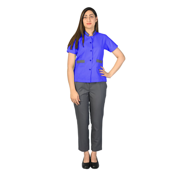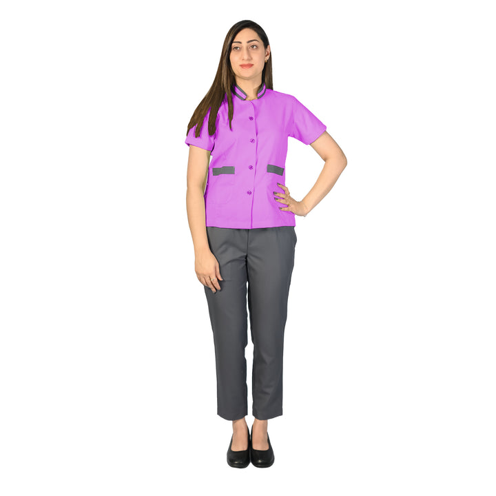 High-quality gabardine fabric for durability, comfort, and a professional appearance. Design: Contrast buttons and piping on the top add a stylish touch. Two cross pockets on the trousers for added functionality. Regular fit for ease of movement and comfort throughout the day. Best Use: Ideal for hotels, homes, cafes, restaurants, spas, salons, and offices. Provides a neat, clean, and professional look for housekeeping and cleaning staff. This uniform set combines practicality with a touch of style, ensuring that staff present a polished appearance while performing their duties.