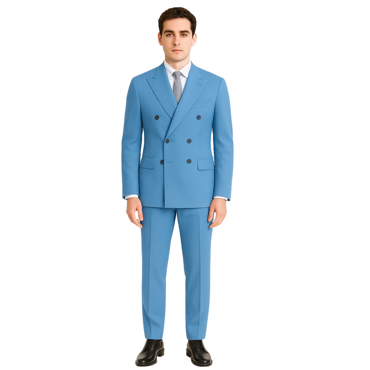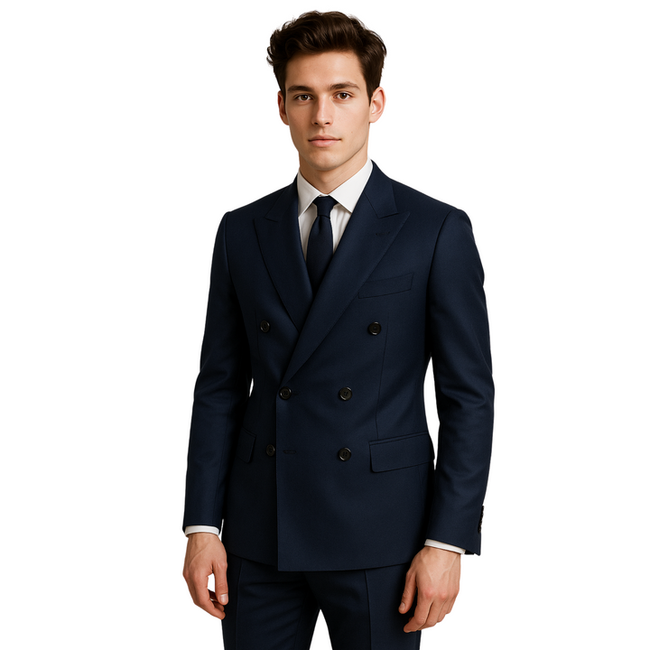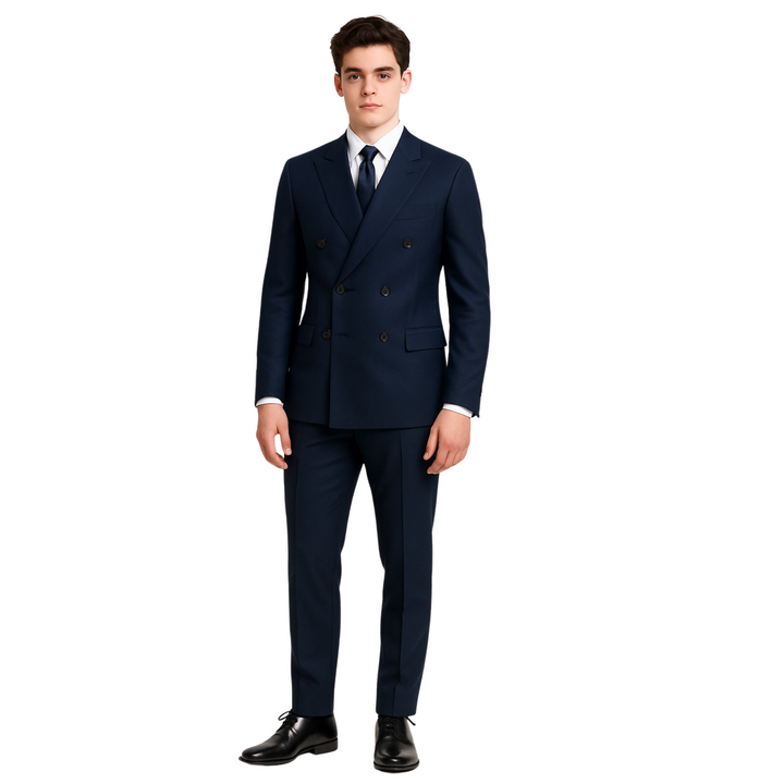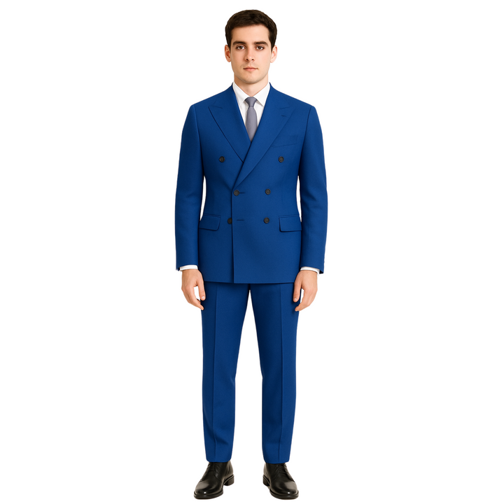 Designed in a regular fit, this suit features a classic 6-button double-breasted front, peak lapels, and functional flap pockets, presenting a timeless yet sharp silhouette. It’s perfect for executives, client meetings, or daily wear in corporate environments.