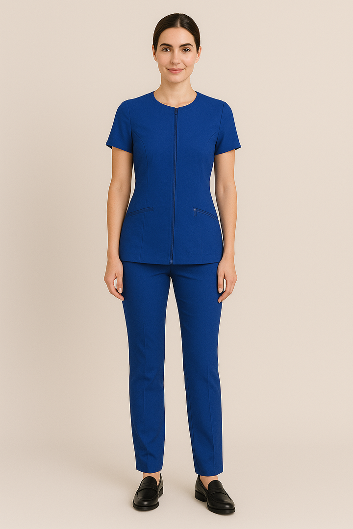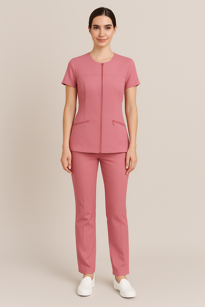 Experience elegance and performance with the Just Needles Ladies Salon Uniform, proudly made in the UAE. This modern uniform is tailored from premium poly viscose lycra that blends comfort, durability, and 4-way stretch.