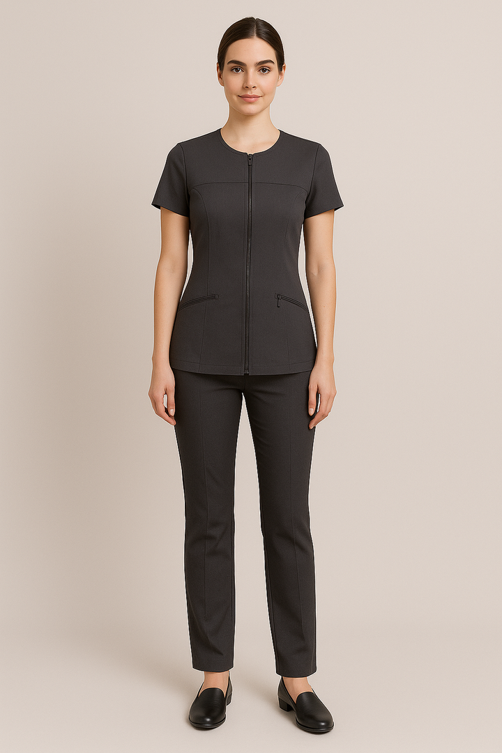 - Sleek zip-front tunic with short sleeves and subtle shaping