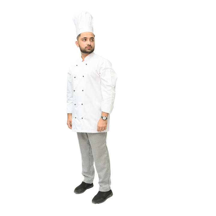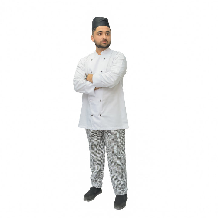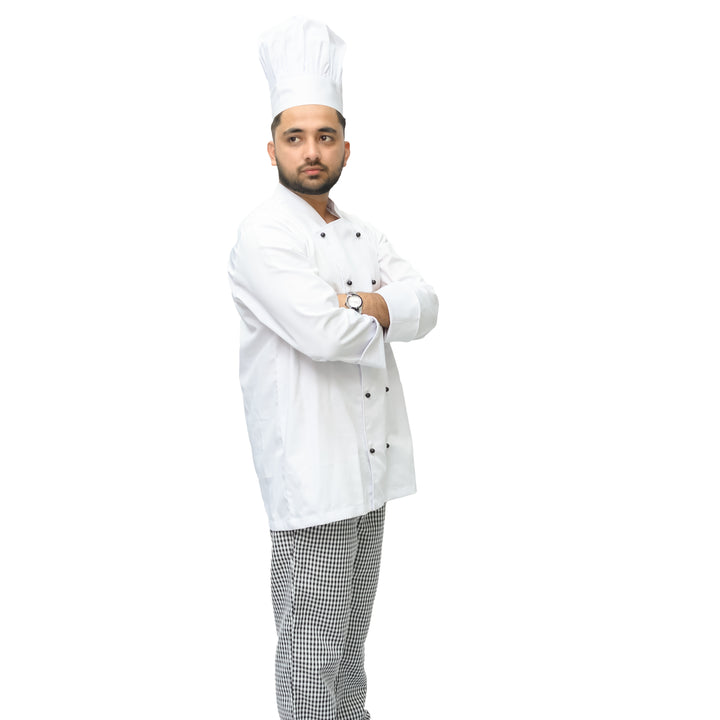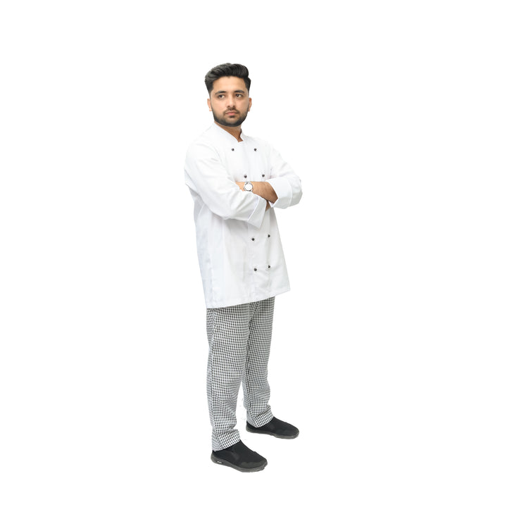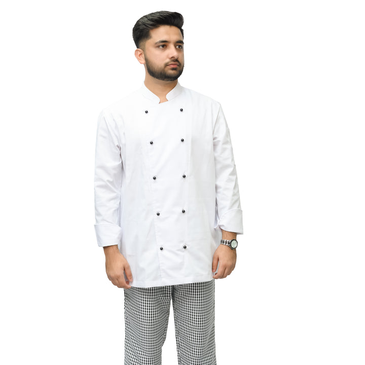 The Unisex chef jacket is designed for all types of kitchen work in white color . It has beautiful black buttons on the front of the jacket to adjust it . Available in white color and different sizes.