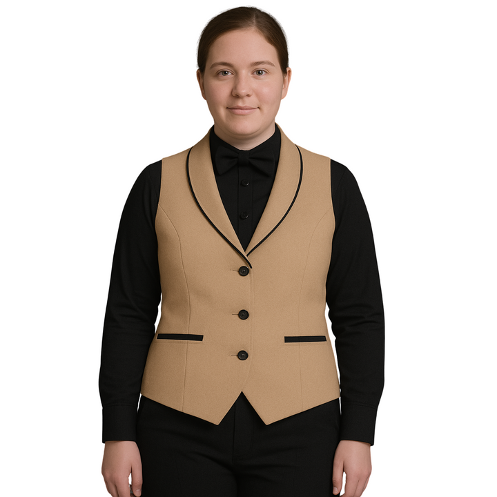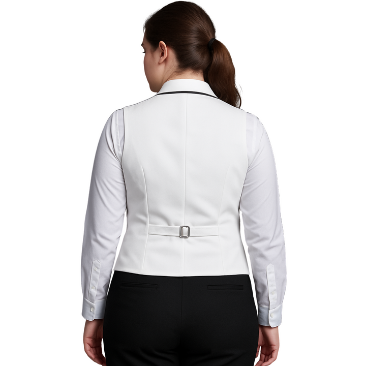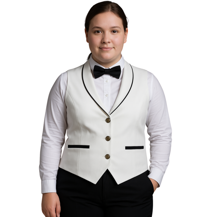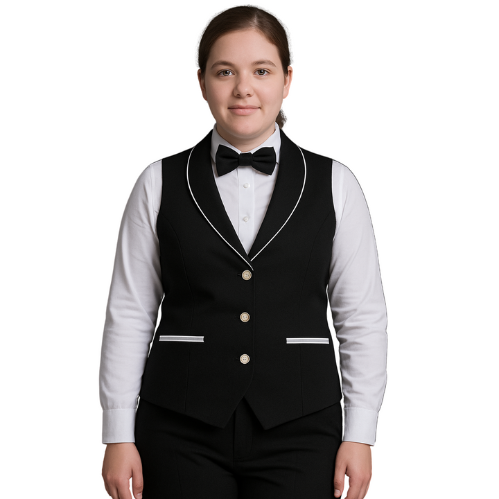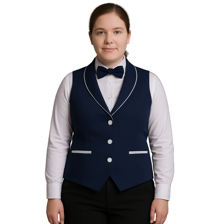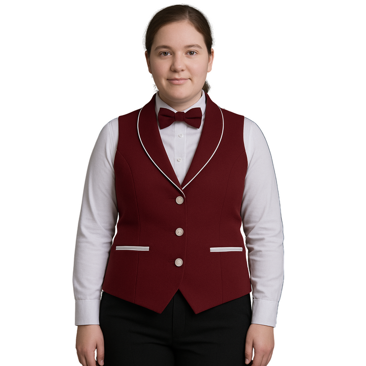 Step into sophistication with this 3-button women’s waistcoat, tailored in high-quality poly wool for all-day comfort and a refined finish. Designed by the Just Needles team in Dubai, this waistcoat features a rounded blazer-style collar highlighted with contrast piping, creating a polished yet modern uniform piece ideal for hospitality, front office, and corporate settings.
